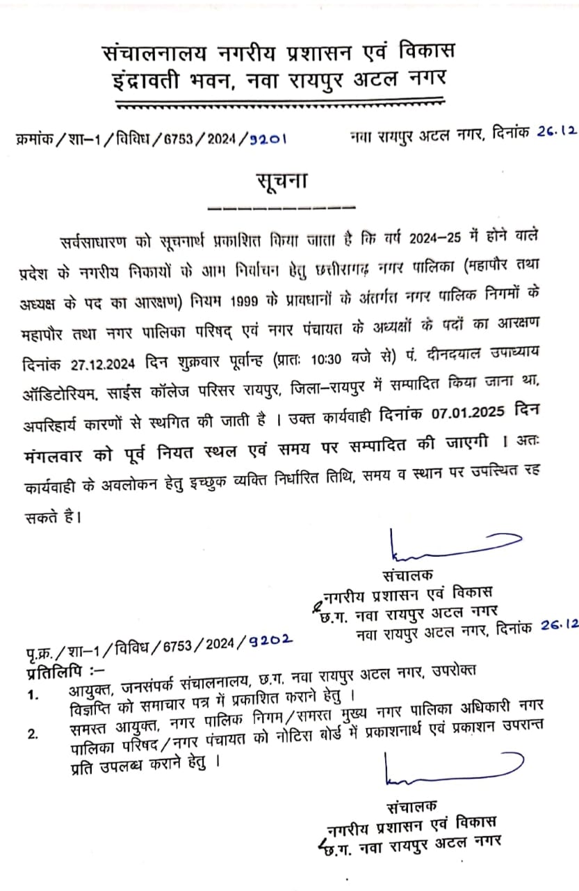 प्रावधानों के अंतर्गत नगर पालिक निगमों के महापौर तथा नगर पालिका परिषद् एवं नगर पंचायत के अध्यक्षों के पदों का आरक्षण दिनांक 27 दिसंबर 2024 दिन शुक्रवार पूर्वान्ह प्रातः