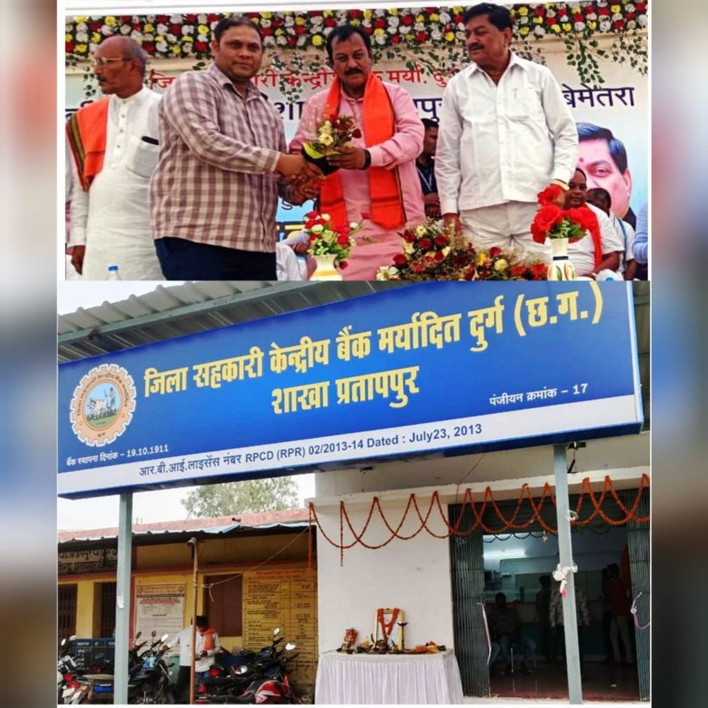 बेमेतरा। 15 जून 2024। दुर्ग सांसद विजय बघेल और खाद्य मंत्री दयाल दास बघेल ने आज दुर्ग जिले के जिला सहकारी केन्द्रीय बैंक मर्यादित, शाखा प्रतापपुर का शुभारंभ किया। दुर्ग सांसद बघेल ने अपनी शुभकामनाएं देते हुए कहा कि नवीन बैंक शाखा खुलने पर इससे ग्रामीण क्षेत्र के आमजनों को लाभ होगा और इस क्षेत्र के किसानों को सुविधा मिलेगी। सहकारी समिति एक ऐसी संस्था है जिसमें काम करने का बहुत अच्छा अवसर रहता है।