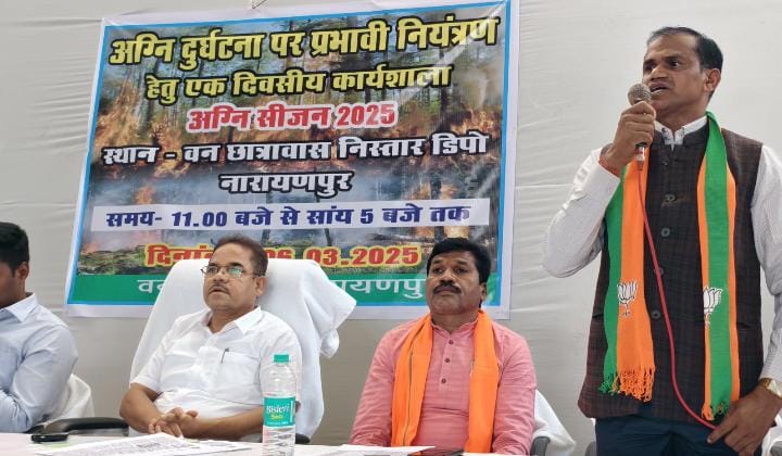 नारायणपुर | वन छात्रावास निस्तार डिपो के सभागार में जनप्रतिनिधि मिडिया कर्मी, वन विभाग के आधिकारी एवं कर्मचारियों की उपस्थित मंे अग्नि घटना पर परभावी नियन्त्रण हेतु कार्यशाला का आयोजन कर दावानल पर वनो की सुरक्षा कैसे करें विषय पर ग्रामीणों को जागरूक किया गया।