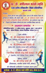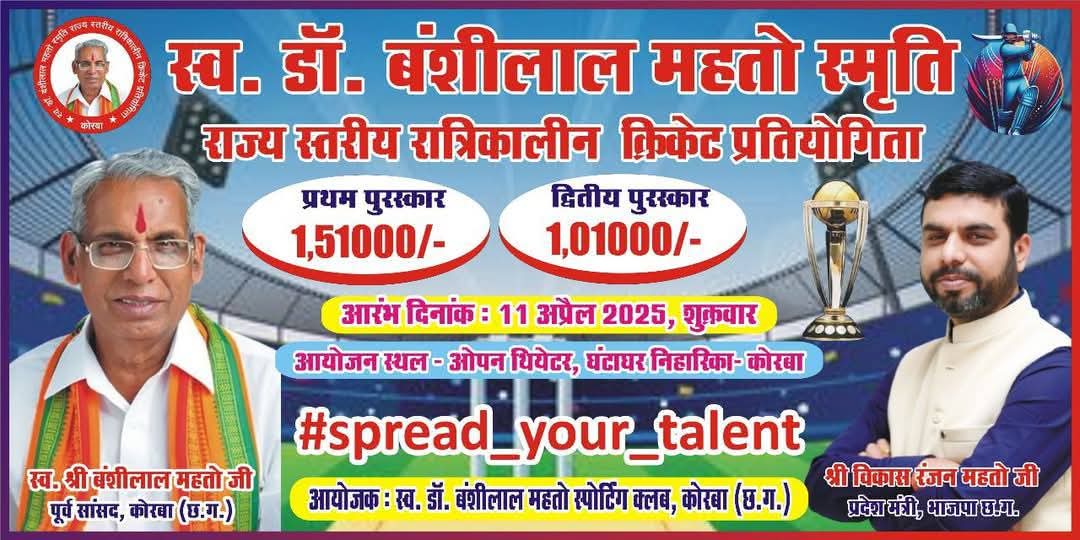 कोरबा जिले के सभी खेलप्रेमियों, नागरिकों और युवा वर्ग को इस ऐतिहासिक क्रिकेट आयोजन का सजीव साक्षी बनने के लिए सादर आमंत्रित किया जाता है। यह आयोजन न केवल खेल के क्षेत्र में एक नया अध्याय जोड़ने जा रहा है, बल्कि समाज में एकता, खेल भावना और समर्पण को भी बढ़ावा देगा।