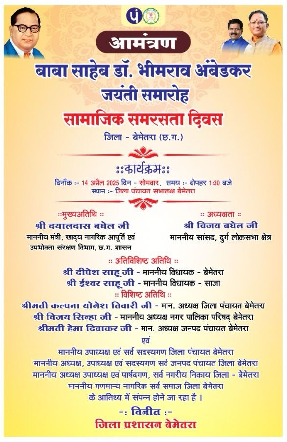 बेमेतरा | 14 अप्रैल 2025 (सोमवार) को डॉ. भीमराव अंबेडकर जयंती एवं सामाजिक समरसता दिवस के अवसर पर कार्यक्रम का आयोजन किया जाएगा। यह समारोह जिला पंचायत सभागार में दोपहर 1:30 बजे से प्रारंभ होगा।