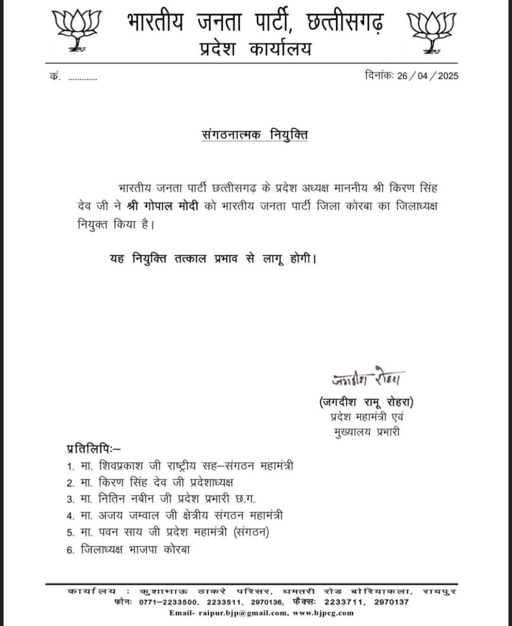 भारतीय जनता पार्टी छत्तीसगढ़ प्रदेश संगठन ने बड़ा बदलाव किया है । प्रदेश अध्यक्ष किरण सिंह देव ने आदेश जारी कर गोपाल मोदी जी को भारतीय जनता पार्टी जिला कोरबा का अध्यक्ष नियुक्त है। गोपाल मोदी कि नियुक्ति तत्काल प्रभाव से लागू कर दी गई है