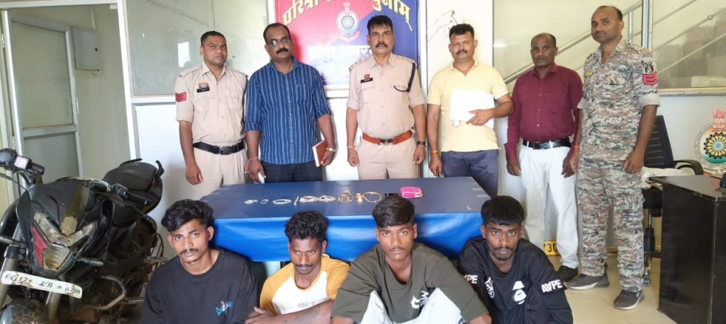 जगदलपुर | नगरनार थाना क्षेत्र के गुमडेल गांव में एक बड़ी चोरी की वारदात को अंजाम देने वाले चार चोरों को पुलिस ने गिरफ्तार कर लिया है। आरोपियों के कब्जे से चोरी गए लाखों रुपये मूल्य के सोने-चांदी के आभूषण और नगद राशि बरामद की गई है।