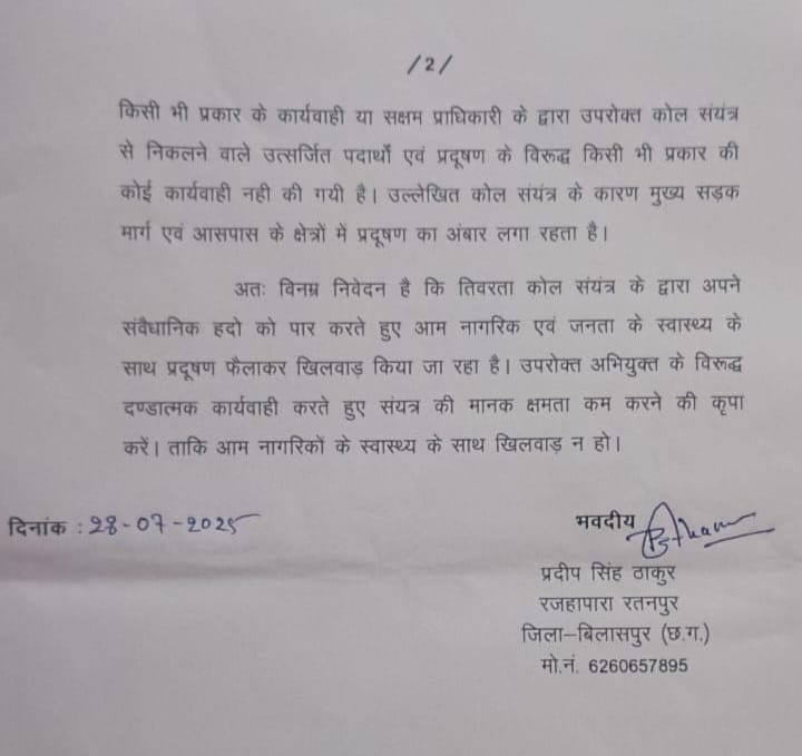 प्रदीप सिंह ठाकुर ने मांग की है कि संयंत्र द्वारा पर्यावरण प्रभाव मूल्यांकन रिपोर्ट और प्रबंधन योजनाओं की अवहेलना को गंभीरता से लेते हुए दंडात्मक कार्यवाही की जाए और संयंत्र की क्षमता घटाई जाए। उन्होंने कहा कि यह कदम बेलतरा क्षेत्र के आम नागरिकों के स्वास्थ्य और पर्यावरण संरक्षण के लिए जरूरी है।