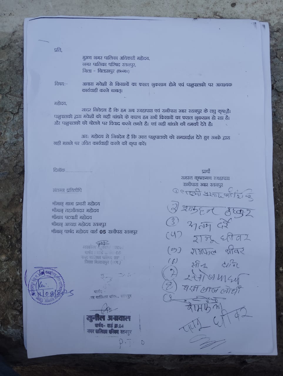 इस समस्या के समाधान के लिए किसानों ने संयुक्त रूप से नगरपालिका रतनपुर, रतनपुर थाना और तहसीलदार कार्यालय में लिखित आवेदन प्रस्तुत किया। आवेदन में उन्होंने जिम्मेदार पशुपालकों के खिलाफ सख्त कार्रवाई की मांग की, ताकि भविष्य में ऐसी स्थिति न बने और किसानों को आर्थिक नुकसान से बचाया जा सके।