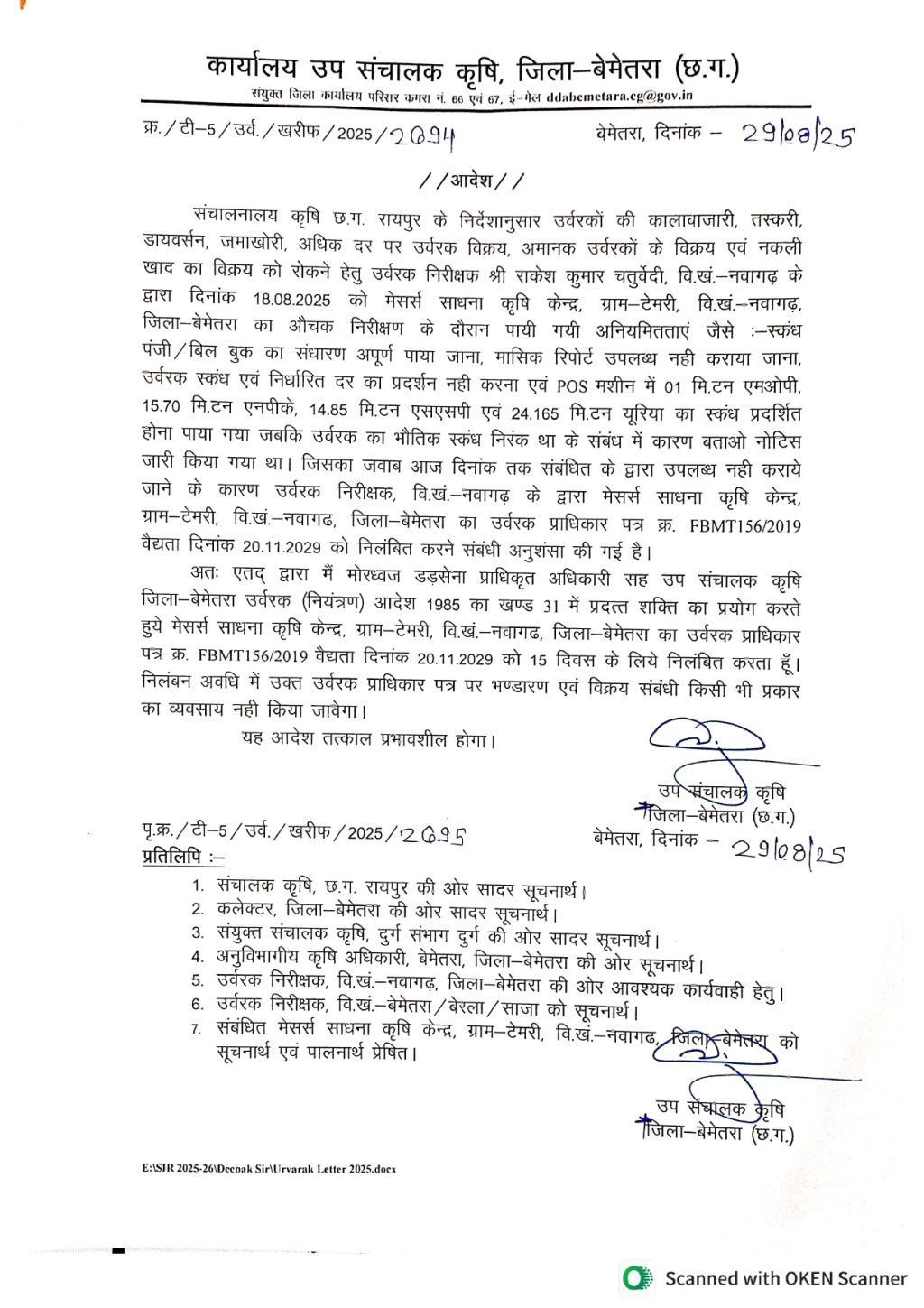 प्रकरण को गंभीर मानते हुए उर्वरक निरीक्षक की अनुशंसा पर प्राधिकृत अधिकारी सह उप संचालक कृषि, जिला बेमेतरा मोरध्वज डड़सेना ने उर्वरक (नियंत्रण) आदेश 1985 के खंड 31 में प्रदत्त शक्तियों का उपयोग करते हुए साधना कृषि केन्द्र का उर्वरक प्राधिकार पत्र क्रमांक FBMT156/2019 जिसकी वैधता 20/11/2029 तक के लिए है | इसे 15 दिनों के लिए निलंबित कर दिया है। निलंबन की अवधि में संबंधित प्राधिकार पत्र पर किसी भी प्रकार का उर्वरक भंडारण एवं विक्रय नजिले में उर्वरक अनियमितताओं पर प्रशासन द्वारा लगातार सख्त कार्रवाई की जा रही है।
