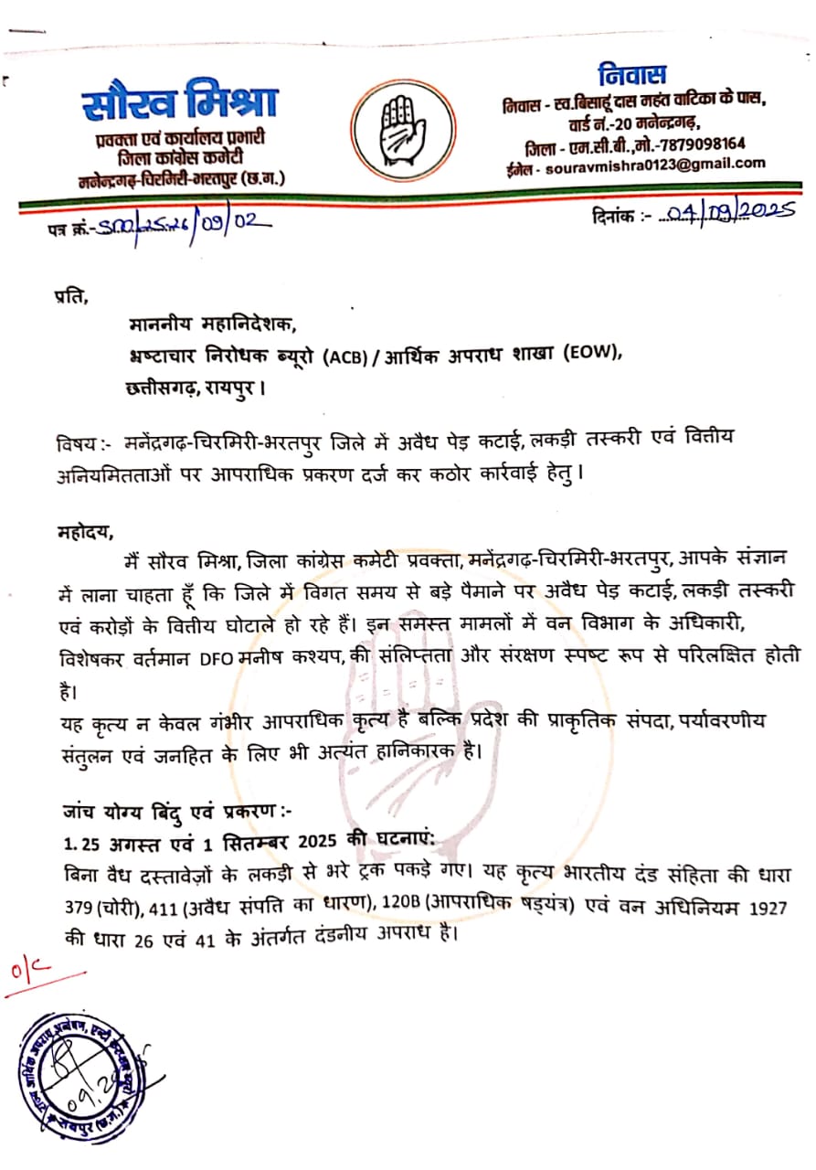 मनेंद्रगढ़। जिला कांग्रेस कमेटी प्रवक्ता सौरव मिश्रा ने भाजपा सरकार पर सीधा हमला बोलते हुए कहा है कि आज प्रदेश में जंगलों की सुरक्षा करने वाला वन विभाग ही तस्करों का सबसे बड़ा संरक्षणदाता बन गया है। जिले में खुलेआम अवैध कटाई और करोड़ों के घोटाले हो रहे हैं, और भाजपा सरकार तथा उसके मंत्री चुप्पी साधे हुए हैं। जिला कांग्रेस कमेटी के प्रवक्ता सौरव मिश्रा ने सम्पूर्ण प्रकरण के जांच के लिए प्रधान मुख्य वन संरक्षक, महानिदेशक भ्रष्टाचार निरोधक ब्यूरो एवं आर्थिक अपराध शाखा में शिकायत की है।