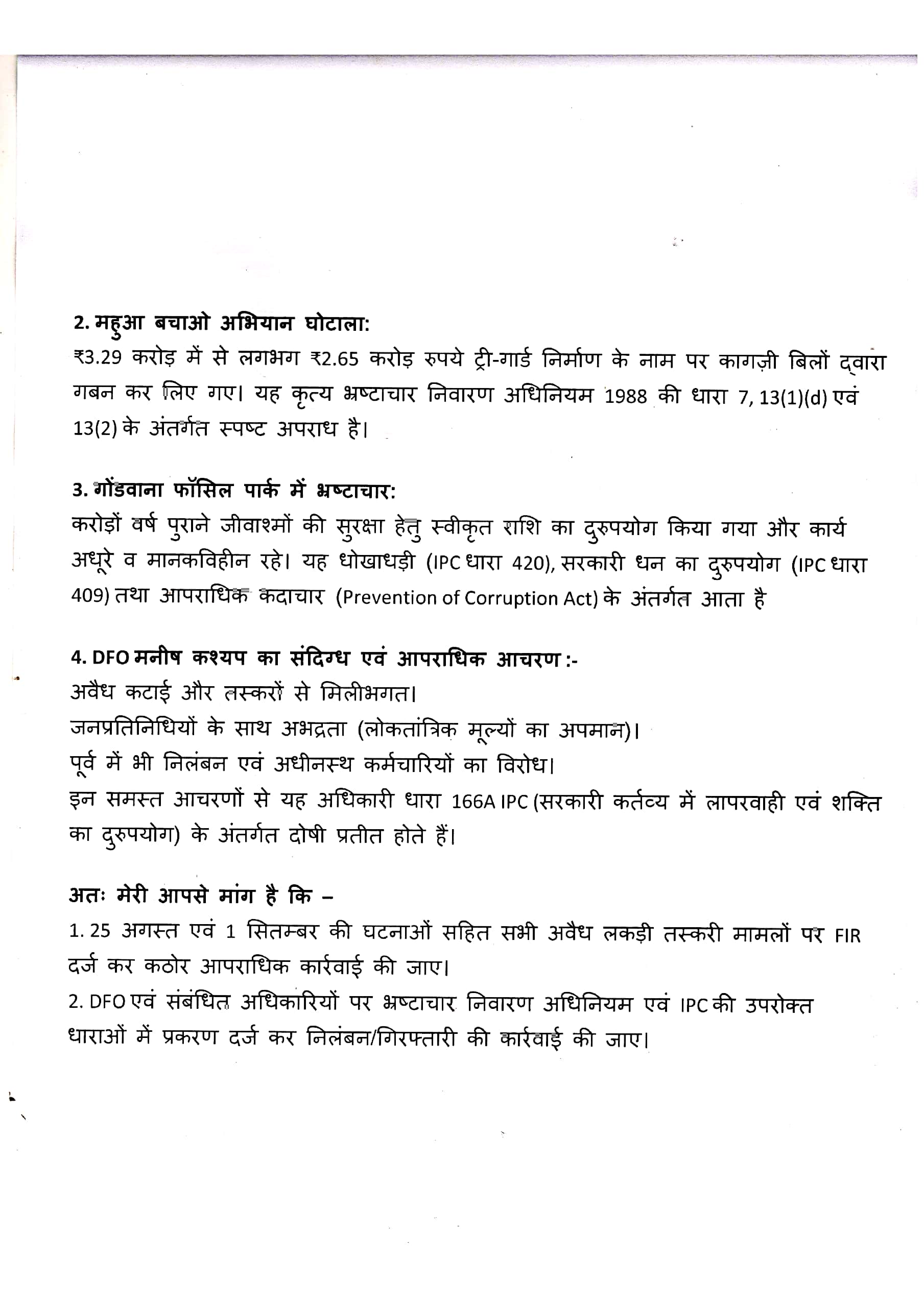 जिला कांग्रेस प्रवक्ता सौरव मिश्रा ने बताया कि उन्होंने छत्तीसगढ़ के वर्तमान प्रधान मुख्य वन संरक्षक (PCCF) भारतीय वन सेवा (IFS) अधिकारी वी. श्रीनिवास राव एवं भ्रष्टाचार निरोधक ब्यूरो एवं आर्थिक अपराध शाखा के उप पुलिस महानिदेशक टी आर कोशिमा सहित गोवर्धन राम ठाकुर से मुलाकात कर उन्हें विस्तृत जानकारी से अवगत करवाते हुए शिकायत पत्र सौंपा है|