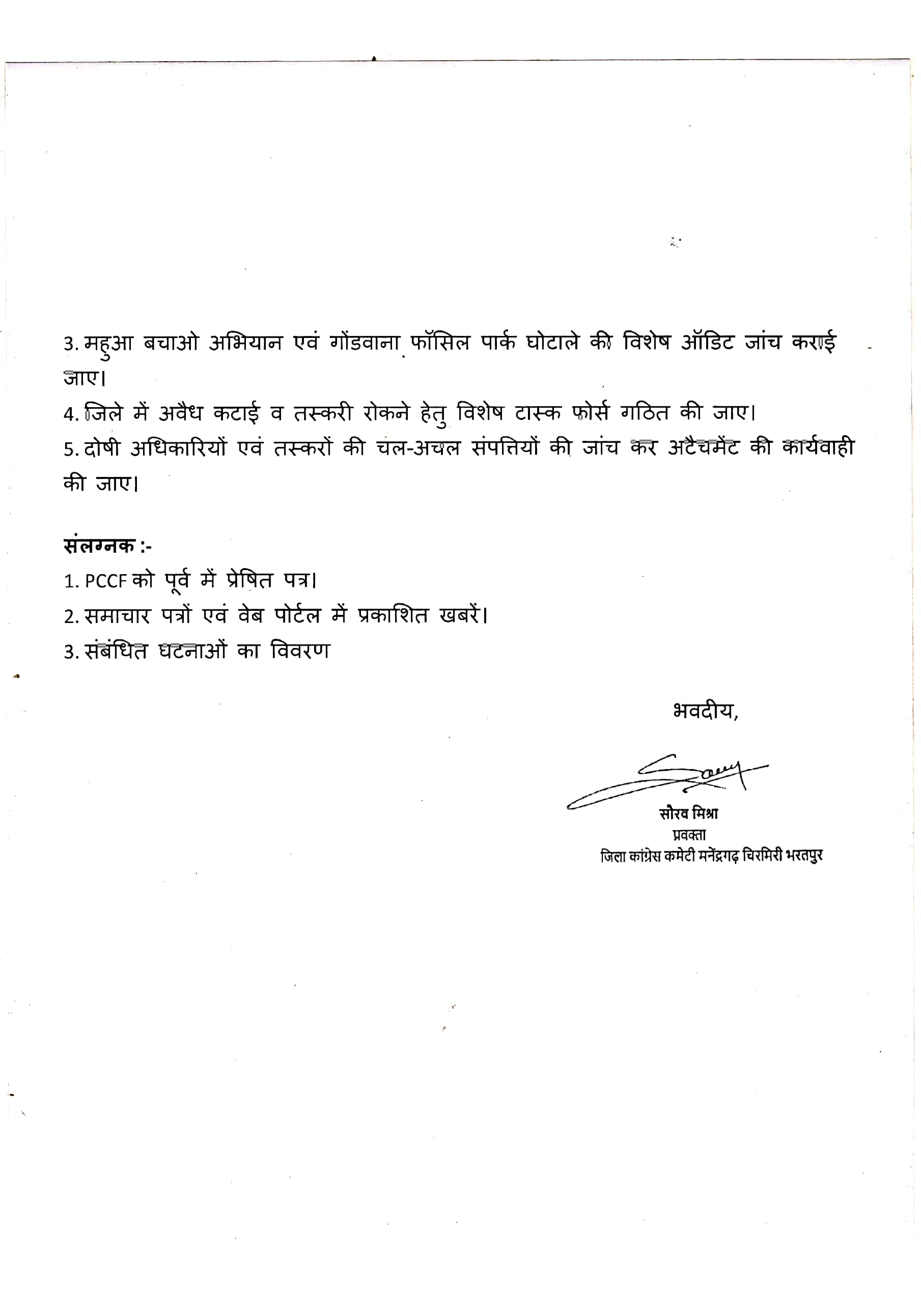 जिला कांग्रेस प्रवक्ता ने मांग की है कि तुरंत FIR दर्ज कर, वनमंडला अधिकारी और संबंधित अधिकारियों को निलंबित किया जाए, महुआ बचाओ अभियान और फॉसिल पार्क घोटाले की विशेष ऑडिट हो तथा जिले में अवैध कटाई रोकने के लिए विशेष टास्क फोर्स बनाई जाए। जिला कांग्रेस प्रवक्ता सौरव मिश्रा ने चेतावनी दी कि अब यह लड़ाई जन और जंगल दोनों के सम्मान की लड़ाई है इसमें कोई समझौता नहीं किया जाएगा यदि भाजपा सरकार ने कार्रवाई नहीं की तो कांग्रेस पार्टी सड़कों पर उतरकर जनआंदोलन करेगी और जंगल बचाने की इस लड़ाई को जनता के साथ मिलकर निर्णायक मोड़ तक पहुंचाएगी।