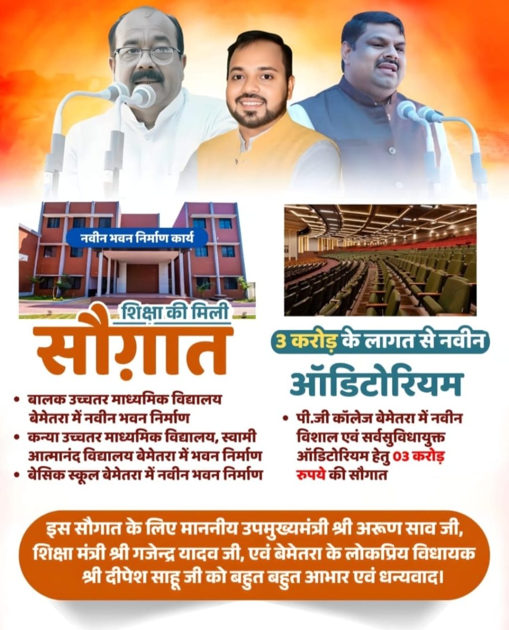 इस दूरदर्शी निर्णय एवं सौगात हेतु उपमुख्यमंत्री अरुण साव , शिक्षा मंत्री गजेन्द्र यादव का बेमेतरा के लोकप्रिय विधायक दीपेश साहू एवं बेमेतरा की जनता ने हार्दिक आभार एवं धन्यवाद ज्ञापित किया.