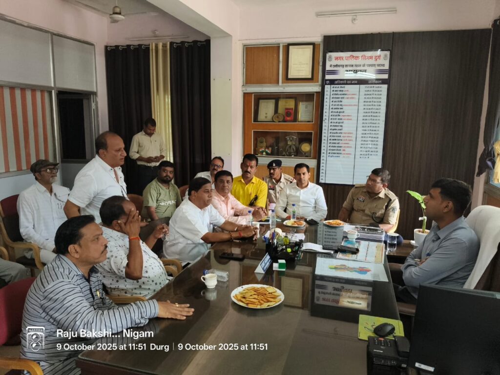 दुर्ग ।त्योहारी सीजन में बाजारों में बढ़ने वाली भीड़ और यातायात जाम की समस्या से निपटने नगर निगम और पुलिस प्रशासन ने मिलकर व्यापक रणनीति तैयार की है। बुधवार को नगर निगम कार्यालय में आयोजित संयुक्त बैठक में निगम आयुक्त सुमित अग्रवाल, एडिशनल एसपी सुखनंद राठौर और एडीएम अभिषेक अग्रवाल सहित छत्तीसगढ़ चेंबर ऑफ कॉमर्स के पदाधिकारी, बाजार अधिकारी एवं नगर निगम अमला मौजूद रहा।
