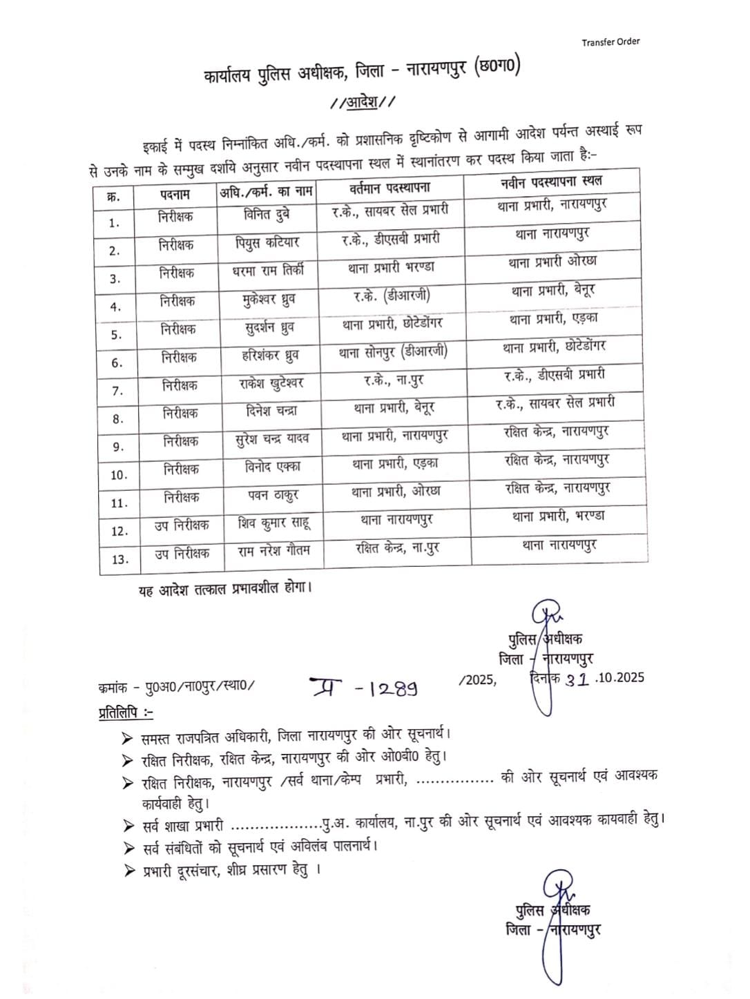 , लंबे वक्त से पदस्थ निरीक्षक, उप निरीक्षक समेत कई पुलिस कर्मियों का हुआ तबादला, जिसमें नारायणपुर थाना प्रभारी सुरेंद्र यादव की जगह विनीत दुबे को प्रभारी बनाया गया, वहीं जिले के छोटेडोंगर ओरछा बेनूर भरडा के थाना प्रभारी भी बदले गए|