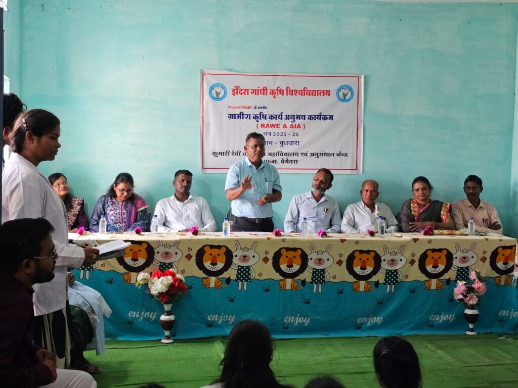 बेमेतरा – कुमारी देवी चौबे कृषि महाविद्यालय एवं अनुसंधान केंद्र साजा ( इंदिरा गांधी कृषि विश्वविद्यालय रायपुर) द्वारा ग्रामीण कृषि कार्य अनुभव कार्यक्रम के अंतर्गत दिनांक 4 नवंबर को ग्राम बुधवारा में कृषि सूचना केंद्र का विधिवत्त शुभारंभ किया गया इस अवसर पर विद्यार्थियों द्वारा पोस्टर एवं मॉडल प्रस्तुतीकरण का भी आयोजन किया गया कार्यक्रम के मुख्य अतिथि गुलमीर मोहम्मद सरपंच थे |
