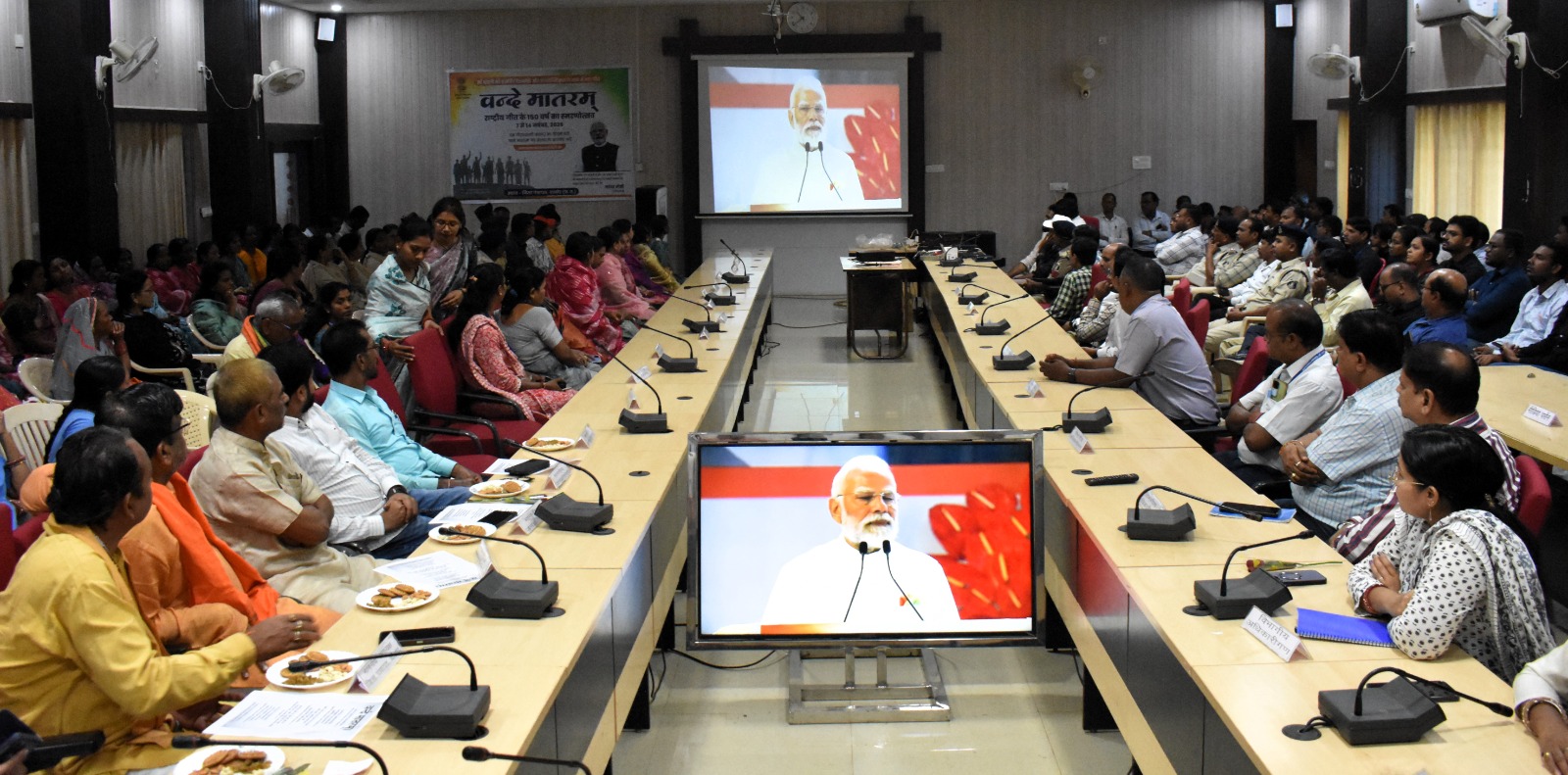 बालोद: राष्ट्रीय गीत ’वंदे मातरम्’ की 150वीं वर्षगांठ के अवसर पर जिला पंचायत बालोद के सभाकक्ष में राष्ट्रीय स्तर के कार्यक्रम का प्रसारण किया गया। कार्यक्रम में प्रधानमंत्री नरेंद्र मोदी ने नई दिल्ली में राष्ट्रीय गीत वंदे मातरम् के 150 वर्ष पूरे होने पर राष्ट्रव्यापी स्मरणोत्सव का शुभारंभ किया। उन्होंने इस अवसर पर वंदे मातरम् 150 साल पूरे होेने पर आगामी दिनों में चलने वाले उत्सव का उद्घाटन किया तथा वंदे मातरम् के अर्थ पर बात की। उन्होंने कहा कि वंदे मातरम् का मतलब संकल्पों की सिद्धी है।