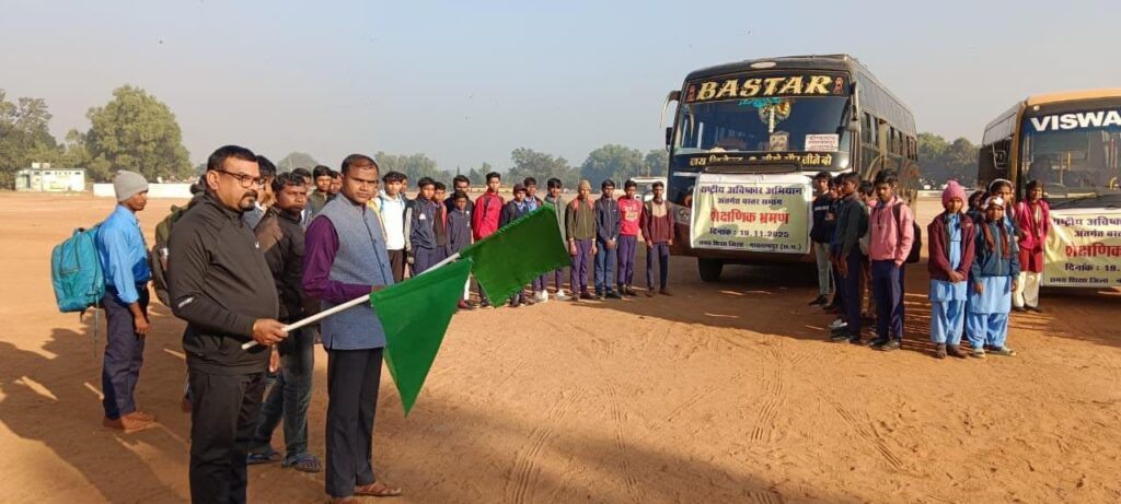 नारायणपुर : राष्ट्रीय आविष्कार अभियान के अंतर्गत सत्र 2025-26 में शासकीय हाईस्कूल एवं हायर सेकेण्डरी स्तर के कुल 100 विद्यार्थियों का शैक्षणिक भ्रमण आज प्रातः 07:30 बजे हरी झण्डी दिखाकर रवाना किया गया। यह भ्रमण राज्य के भीतर बस्तर संभाग के प्रमुख संस्थानों जगदलपुर एयरपोर्ट, मेडिकल कॉलेज, लामनी पार्क, इंजीनियरिंग कॉलेज आदि में आयोजित किया जा रहा है।