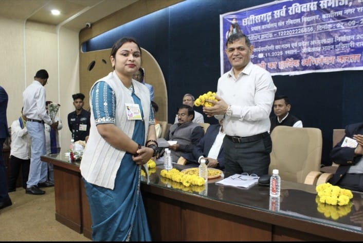 खैरागढ़ । छत्तीसगढ़ की राजधानी में रविवार 22 नवम्बर 2025 को वृंदावन हॉल सिविल लाइन रायपुर मे आयोजित सर्व रविदास समाज के भव्य शपथ ग्रहण समारोह में सामाजिक एकता और समरसता का अद्भुत संगम देखने को मिला। इसी कार्यक्रम की सबसे प्रेरक उपलब्धि रही खैरागढ़ की वंदना टांडेकर का प्रदेश संगठन सचिव के रूप में चयन।