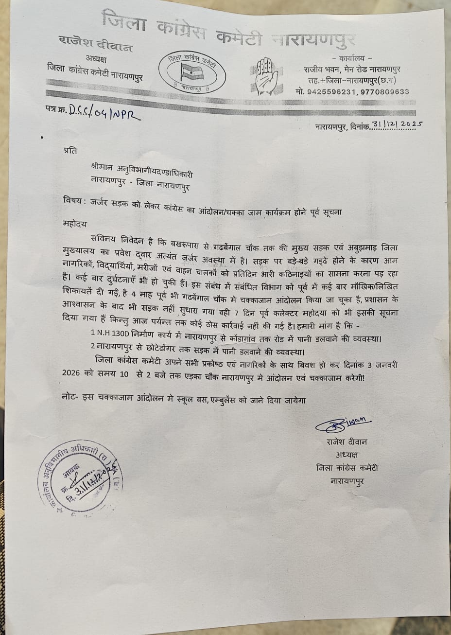 नारायणपुर – बखरूपारा से गढ़बेंगाल चौक तक की सड़क अत्यधिक जर्जर सड़क को लेकर बार बार आंदोलन के बाद भी शासन प्रशासन को सड़क बनाने की उदाशीनता से रोज आम जनता जर्जर और गड्ढों सड़क मे पीस रही हैं, जबकि 4 माह पूर्व भी कांग्रेस कमेटी ने नगर बंद कर गढ़बेंगाल चौक मे चक्का जाम कर आंदोलन किया था प्रशासन के वरिष्ठ अधिकारियो के आश्वासन के बाद यहाँ आंदोलन को समाप्त किया गया था आश्वासन के बाद भी प्रशासन आज पर्यन्त तक सड़क नहीं बना सकी हैं|