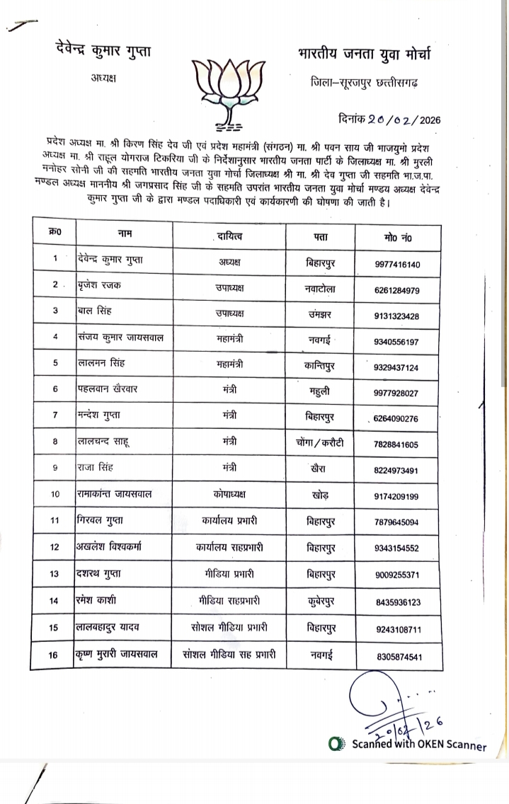 गठन इन कार्यकर्ताओं को सौंपा गया यह जिम्मेदारियां जाने किसको मिली कौनसा पद और कौन जिम्मेदारी सौंपी गई है बृजेश रजक एवं बाल सिंह को युवा मोर्चा मंडल बिहरपुर उपाध्यक्ष की कमान सौपी गई है संजय कुमार जयसवाल लाल मन सिंह को युवा मोर्चा मंडल महामंत्री की कमान सौंपी गई है पहलवान खैरवार मंनदेश गुप्ता लालचंद साहू राजा सिंह को मंत्री पद का दायित्व दी गई है|