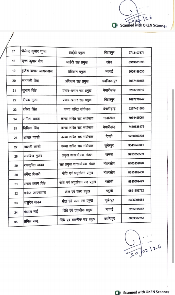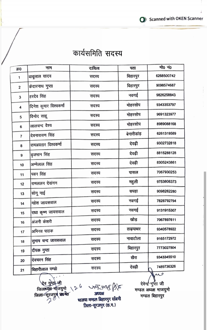 रमाकांत जायसवाल कोषाध्यक्ष गिरबल गुप्ता कार्यालय प्रभारी अखिलेश विश्वकर्मा कार्यालय सह प्रभारी दशरथ अग्रहरि युवा मोर्चा मंडल मिडिया प्रभारी रमेश काशी मीडिया सह प्रभारी लाल बहादुर यादव युवा मोर्चा मंडल सोशल मीडिया प्रभारी कृष्ण मुरारी जायसवाल सोशल मीडिया सह प्रभारी पोले्द गुप्ता आईटी प्रमुख कृष्ण कुमार सिंह आईटी शह प्रमुख बृजेश कुमार जायसवाल प्रशिक्षण प्रमुख सभापति प्रशिक्षण सह प्रमुख दीपक गुप्ता प्रचार-प्रसार सह प्रमुख सुभाग सिंह प्रचार प्रसार सह प्रमुख बबीता सिंह दीपिका सिंह आंचल काशी संगीता यादव लालती काशी कन्या शक्ति सह संयोजक की जिम्मेदारियां सौंपी गई है|