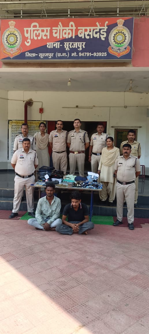 मामले की सूचना पर डीआईजी व एसएसपी सूरजपुर, प्रशांत कुमार ठाकुर ने चोरी का जल्द खुलासा कर आरोपी को पकड़ने के निर्देश दिए। चौकी बसदेई पुलिस ने मामले की विवेचना कर चोर की पतासाजी करने में लगी थी इसी बीच मुखबीर से सूचना मिली कि ग्राम शिवप्रसादनगर के राहुल व मानसाय दोनों रात्रि में घुम रहे थे दोनों पूर्व में हदीस के दुकान में चोरी किए थे जिसके बाद दोनों संदेहियों को पकड़ा गया। पूछताछ पर दोनों ने किराना एवं रेडिमेट दुकान में चोरी करना स्वीकार किया जिनके निशानदेही पर सीसीटीव्ही का डीव्हीआर 1 नग, नगदी 11140 रूपये, जीन्स पेंट 11 नग, शर्ट 13 नग, लोअर 3, सेरवानी 1 सेट, कोट 1 नग, गुटखा, सिगरेट, एटीएम व क्रेडिट कार्ड, पेन-आधार कार्ड, सोने का कंगन 2 नग कुल कीमत 93 हजार रूपये जप्त किया गया। आरोपी पूर्व में भी चोरी के मामले में चालान हो चुके है। मामले में संगठित अपराध घटित करने से प्रकरण में धारा 111 बीएनएस जोड़ते हुए आरोपी राहुल सोनवानी पिता माधव राम सोनवानी उम्र 19 वर्ष ग्र्र्राम शिवप्रसादनगर व मानसाय खरसनिहां पिता गोलन राम खरसनिहां उम्र 29 वर्ष सा. शिवप्रसादनगर चौकी बसदेई को गिरफ्तार किया गया। इस कार्यवाही सीएसपी सूरजपुर बेनार्ड कुजूर के मार्गदर्शन में चौकी प्रभारी बसदेई योगेन्द्र जायसवाल, प्रधान आरक्षक महेन्द्र सिंह, आरक्षक देवदत्त दुबे, महेन्द्र प्रताप सिंह, अभय तिवारी, निलेश जायसवाल, राकेश सिंह, आदित्य यादव, अशोक सिंह, अनिल विश्वकर्मा व अशोक केंवट सक्रिय रहे।