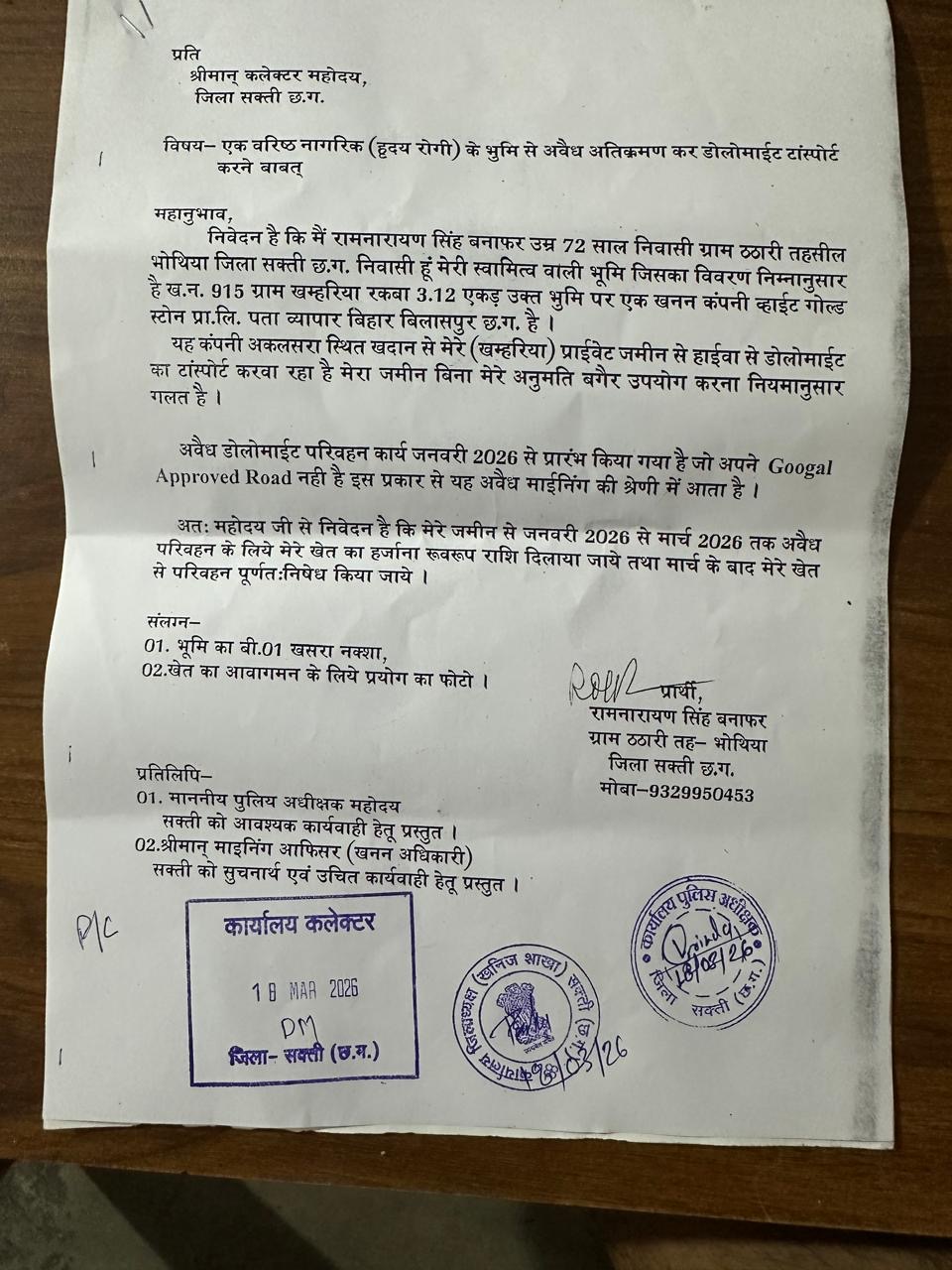 जिला शक्ति से एक समाचार प्राप्त हुवा है कि एक खनन कंपनी व्हाइट गोल्ड स्टोन प्राइवेट लिमिटेड, जिसका मुख्यालय व्यापार विहार, बिलासपुर है, उक्त कंपनी द्वारा अवैध डोलोमाइट परिवहन किया जा रहा है एवं इस अवैध परिवहन हेतु निजी मालिकों के खेत को भी बक्शा नहीं जा रहा है | इस सम्बंध में रामनारायण सिंह बनाफर, ग्राम ठठारी, तहसील भोथीया, जिला सक्ती (छत्तीसगढ़) द्वारा दिनाँक: 18 मार्च 2026 को कलेक्टर को शिकायत के बाद भी आज तक उस कंपनी के अवैध खनन या परिवहन पर कोई कार्यवाही नहीं किया गया है , जिसके चलते ग्रामीणों में असंतोष व्याप्त है एवं जिला प्रशासन के कार्य करने की गतिविधि पर संदेह उत्पन्न होता है | सक्ती जिले के खनन विभाग की चुप्पी रहस्यमय बना हुवा है |