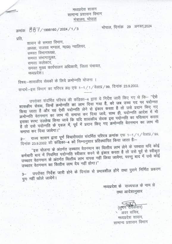 कर्मचारियों की पदोन्नति को लेकर सामान्य प्रशासन विभाग ने इस संबंध में आदेश जारी कर दिए हैं आदेश के मुताबिक चार स्तरीय समयमान वेतनमान लागू किए जाने के बाद कर्मचारियों को निर्धारित सेवा पूरी होने के बाद वरिष्ठ पद का वेतनमान का लाभ दिया जाता था लेकिन जब उन्हें उच्च पद पर पदोन्नत किया जाता था तो कई कर्मचारी पदोन्नति लेने से इंकार कर देते थे ऐसी स्थिति में कर्मचारी को दी गई क्रमोन्नति वेतनमान का लाभ भी समाप्त कर दिया जाता था साथ ही पदोन्नति आदेश में भी इसका उल्लेख किया जाता था यदि शासकीय कर्मचारी इस पदोन्नति को छोड़ता है तो उसे पदोन्नति के एवज में पहले से दी जा रही क्रमोन्नति वेतनमान का लाभ भी समाप्त कर दिया जाएगा।