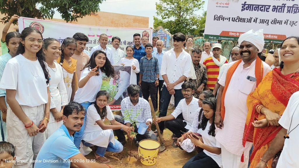 नारायणपुर | आज विहंगम योग संत समाज जिला नारायणपुर के द्वारा संत शिरोमणी नामदेव जी महाराज के पावन जन्मोत्सव के अवसर पर “Name tree -Mission Green Earth” तथा माननीय प्रधानमंत्री महोदय जी के अपील “एक पेड़ मां के नाम” के अंतर्गत 1001 नग नीम पौधारोपण कार्यक्रम किया गया। विहंगम योग के नेतृत्व में विभिन्न स्कूली छात्र-छात्राओं के द्वारा पर्यावरण संरक्षण व जागरूकता का संदेश देते हुए हाथों में पौधा लेकर शहर में विशाल रैली निकाली गई। उक्त रैली को डिंपल जैन जी के नेतृत्व में जैन समाज के द्वारा बिस्कीट व पानी वितरण किया गया।
