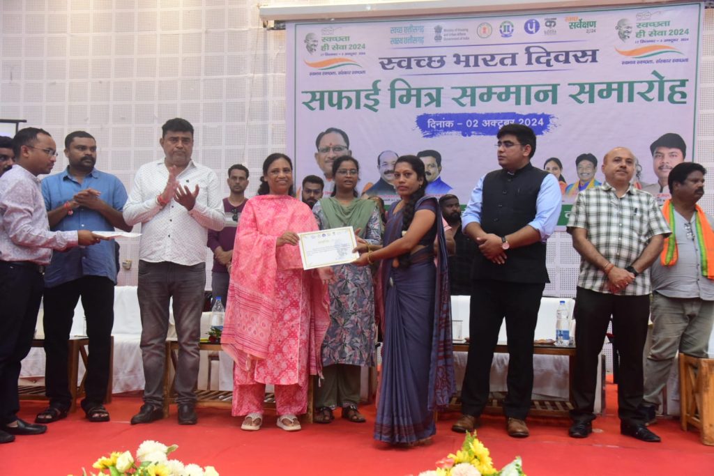 कोंडागांव| स्वच्छता ही सेवा अभियान-2024 के तहत 17 सितंबर से चलाए जा रहे स्वच्छता अभियान का आज महात्मा गांधी की जयंती पर समापन हुआ। इस मौके पर स्वच्छ भारत दिवस के अवसर पर सफाई मित्र सम्मान समारोह का आयोजन विधायक कोंडागांव एवं बस्तर विकास प्राधिकरण के उपाध्यक्ष सु लता उसेंडी के मुख्य आतिथ्य में शहर के ऑडिटोरियम में संपन्न हुआ। सम्मान समारोह को संबोधित करते हुए विधायक सु उसेंडी ने कहा कि आज हमारे देश के दो महान विभूतियों राष्ट्रपिता महात्मा गांधी और लाल बहादुर शास्त्री के जन्मदिवस के अवसर पर स्वच्छता ही सेवा अभियान का समापन हो रहा है। लेकिन ये सिर्फ पखवाडे का समापन है, स्वच्छता के लिए तो हमें निरंतर कार्य करना है। प्रधानमंत्री नरेन्द्र मोदी के आह्वान पर स्वच्छता ही सेवा के अंतर्गत 17 सितंबर से लगातार विभिन्न गतिविधियों का आयोजन किया गया, जिससे लोगों मंे स्वच्छता के प्रति जागरूकता आई।