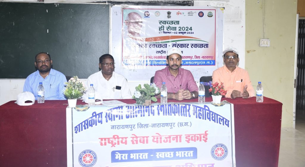 नारायणपुर | युवा एवं खेल मंत्रालय, राष्ट्रीय सेवा योजना, और शहीद महेन्द्र कर्मा विश्वविद्यालय जगदलपुर, बस्तर के निर्देशन में शासकीय स्वामी आत्मानंद स्नातकोत्तर महाविद्यालय नारायणपुर में 17 सितंबर से 2 अक्टूबर तक स्वच्छता पखवाड़ा आयोजित किया गया। यह अभियान “स्वभाव स्वच्छता, संस्कार स्वच्छता” की थीम पर आधारित था। गांधी जयंती के अवसर पर समापन समारोह में मुख्य अतिथि वासु जैन, मुख्य कार्यपालन अधिकारी, जिला पंचायत नारायणपुर ने दीप प्रज्वलन कर कार्यक्रम का शुभारंभ किया। महाविद्यालय के प्राचार्य डॉ. सखा राम कुंजाम ने स्वागत भाषण में स्वच्छता के महत्व पर जोर दिया और छात्रों को प्रेरित किया।